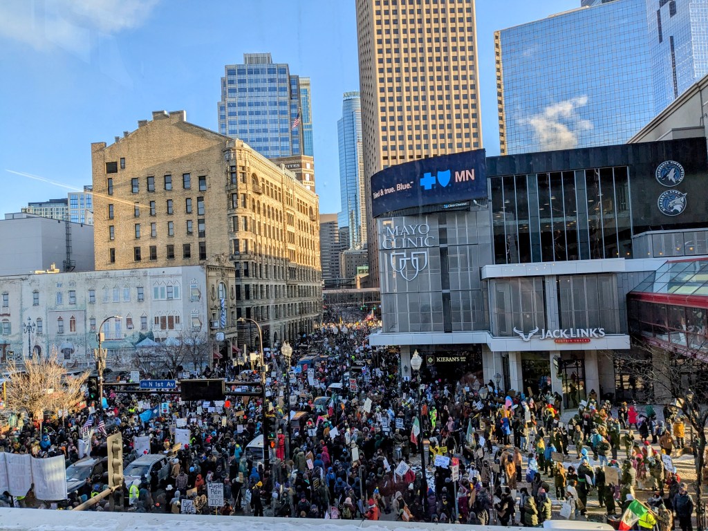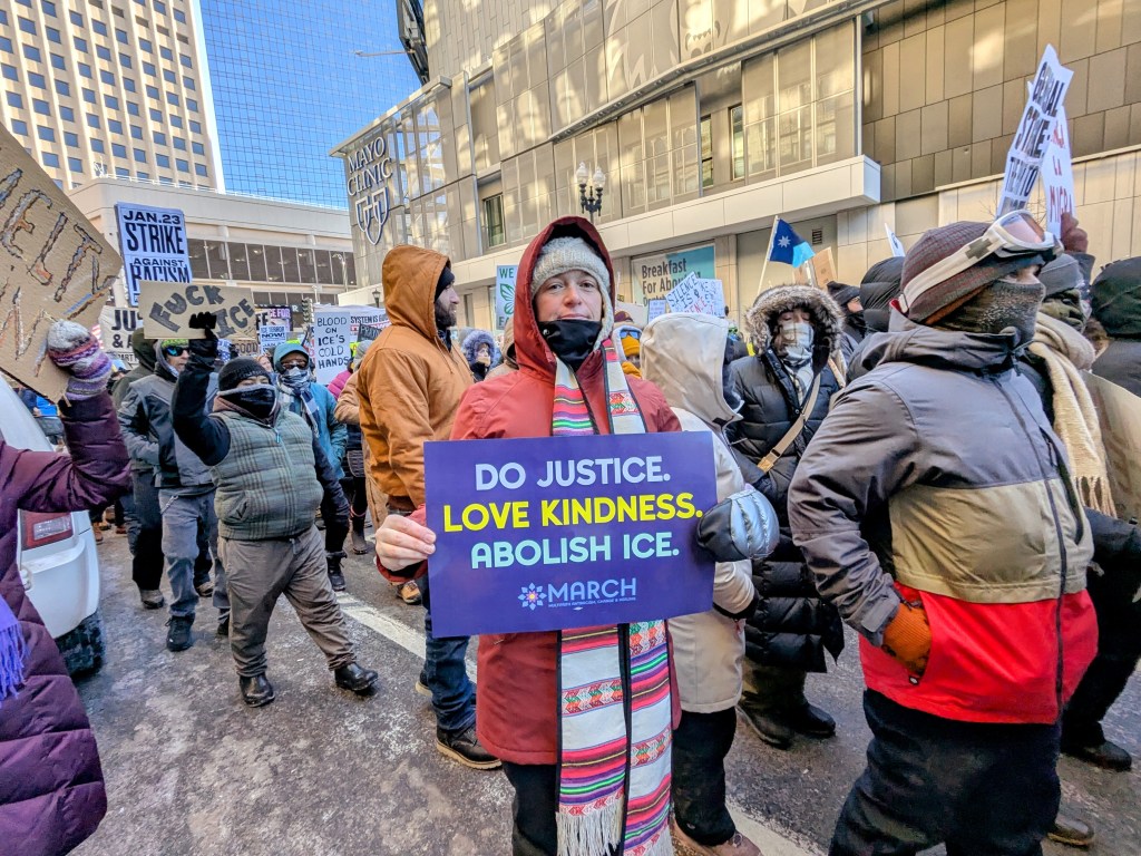 I flew home from Minneapolis late this morning and federal agents had already murdered another person observing ICE activity. Yesterday, I marched with more than 50,000 people, filling the streets of downtown Minneapolis, chanting, ICE OUT! I spent two days learning from community members and interfaith clergy, people traumatized by the violence in their community but resilient and persistent in their commitment to justice, love, and the protection of their neighbors.